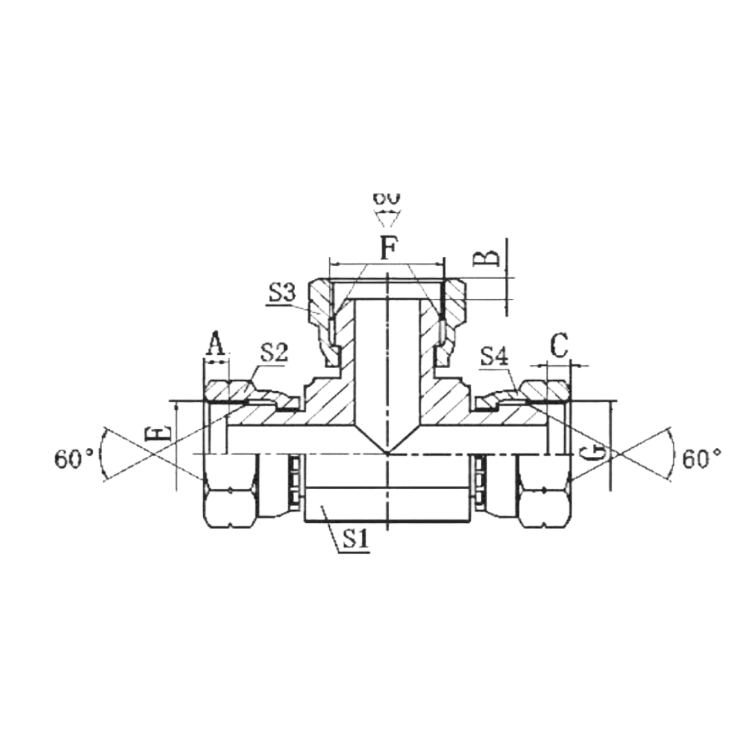 ?Tee fitting featuring BSPP Female 60 DEGREE Cone connections on all three ports for symmetrical flow division.?