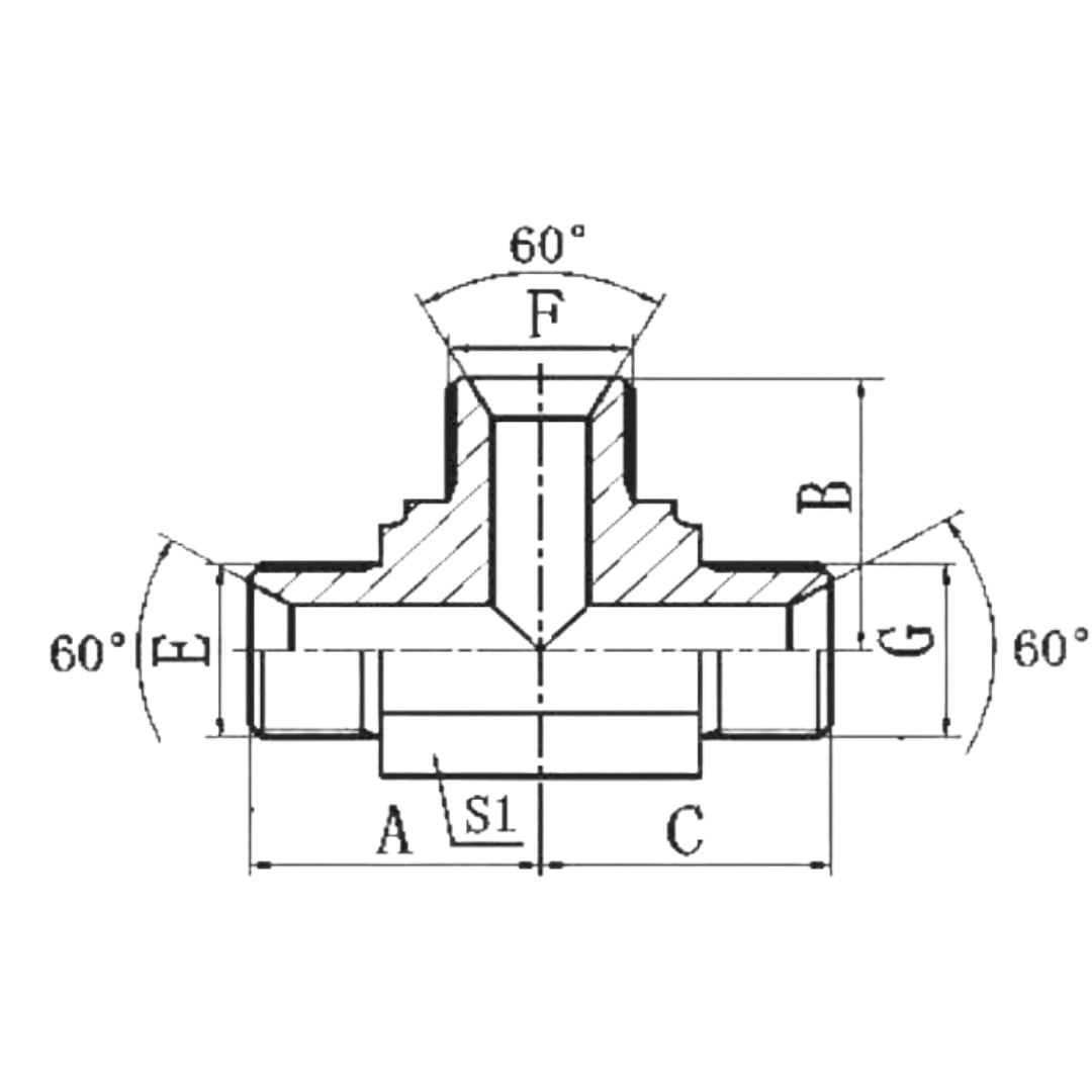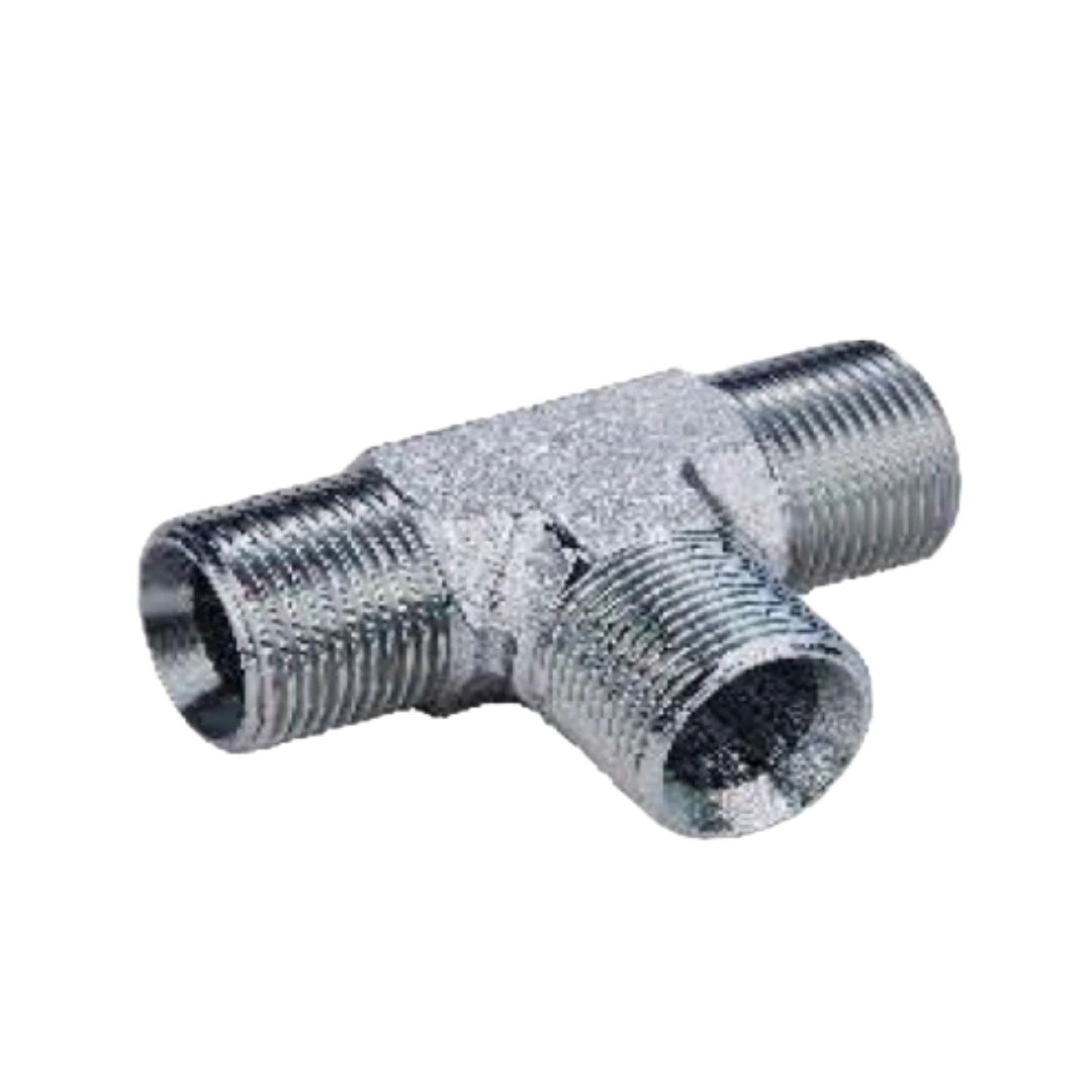 ?Tee connector with BSPP Male 60 DEGREE Seat, enabling three-way flow distribution in rigid piping systems.?