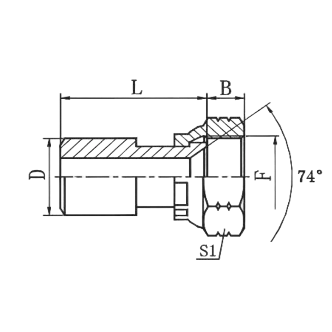 A tube fitting with welded connection on one end and female JIC 74-degree seat on the other.