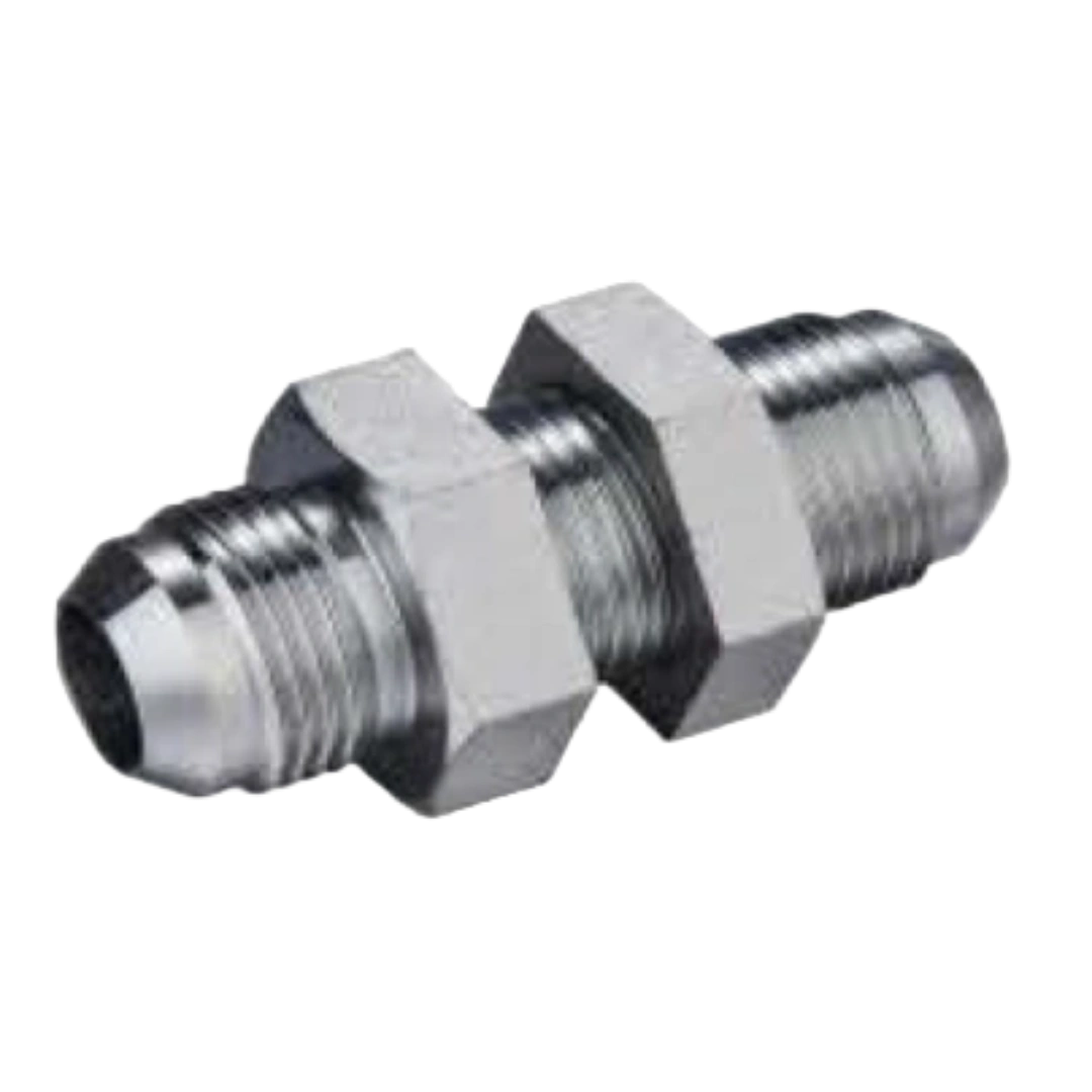 A bulkhead-mounted male JIC 74-degree flare fitting for panel or wall penetration.