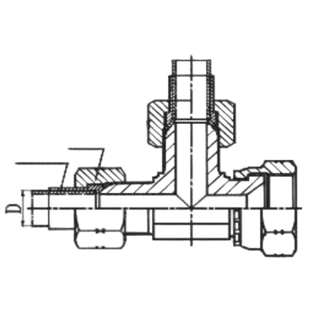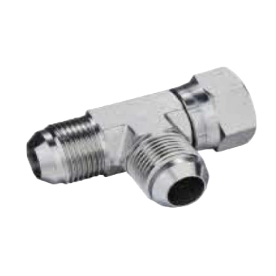 A run-type tee fitting designed for inline connections with male JIC flare and female JIC seat ports.