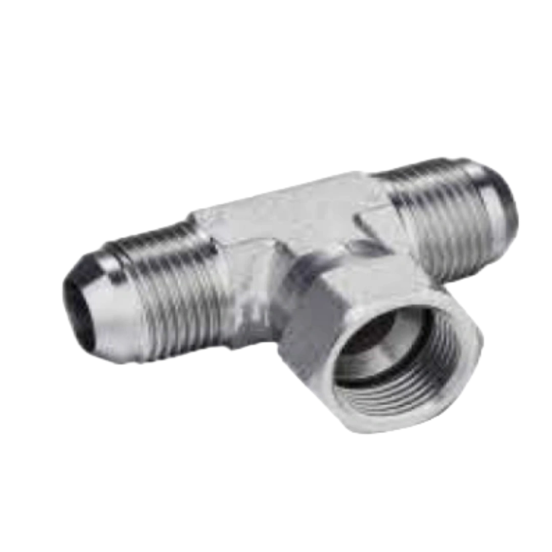 A branching tee fitting that accepts male JIC flare connections with a female JIC branch port.