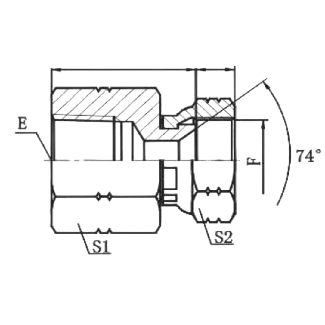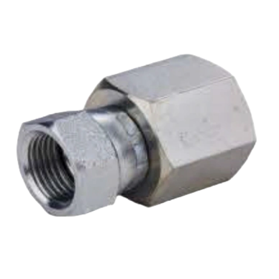 A fitting that converts NPT female pipe threads to JIC female 74-degree seat.