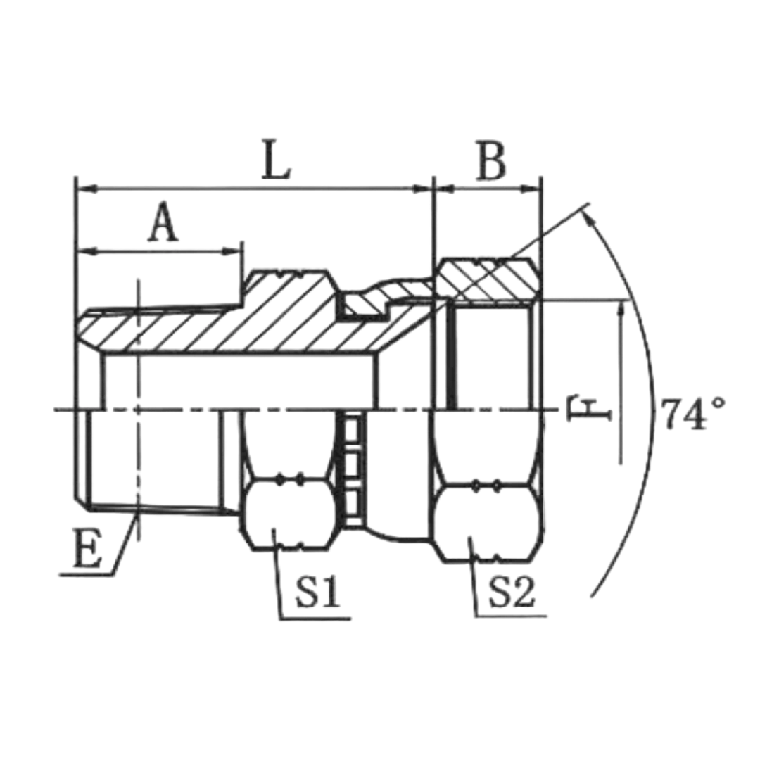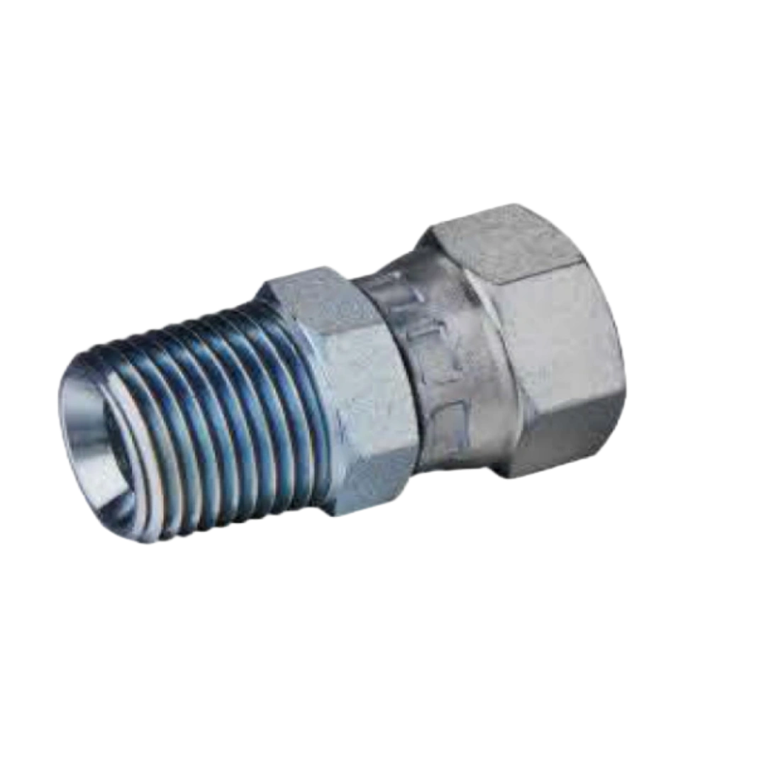 An adapter that connects NPT male pipe threads to female JIC 74-degree seat.